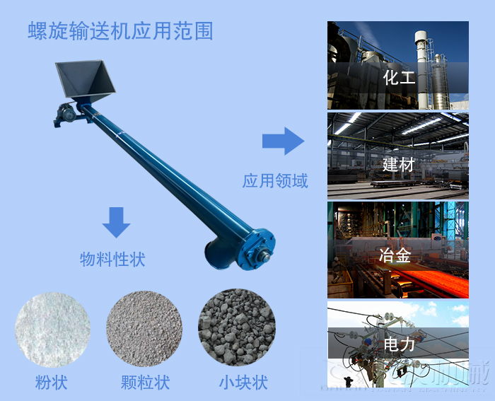 螺旋機(jī)廣泛應(yīng)用于建材,化工,電力,冶金,木炭,糧食等行業(yè)。 它適合水平或傾斜地輸送粉狀,顆粒狀和小塊狀物料,例如煤,灰,渣,水泥和谷物等,輸送物料溫度低于200°C。 螺旋輸送機(jī)不適用于輸送容易變質(zhì),黏稠和結(jié)塊的物料。