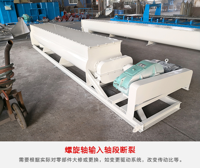由于螺旋給料機(jī)安裝時(shí),螺旋軸同軸度超差或選軸時(shí)安全系數(shù)偏低等引起,根據(jù)生產(chǎn)需要進(jìn)行設(shè)備改造維護(hù),當(dāng)工藝變化,超出設(shè)備性能范圍時(shí),繼續(xù)運(yùn)行會(huì)造成設(shè)備快速損壞,甚至滿(mǎn)足不了生產(chǎn)工藝要求,影響正常生產(chǎn)。需要根據(jù)實(shí)際情況和現(xiàn)場(chǎng)條件,對(duì)零部件大修更換,如變更驅(qū)動(dòng)系統(tǒng),改變傳動(dòng)比,提高備件材料性能或尺寸變化,直至更換設(shè)備。
