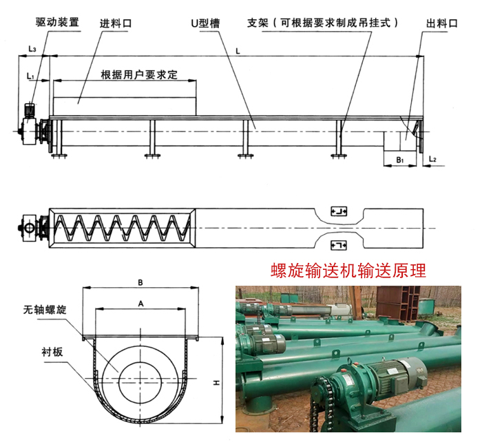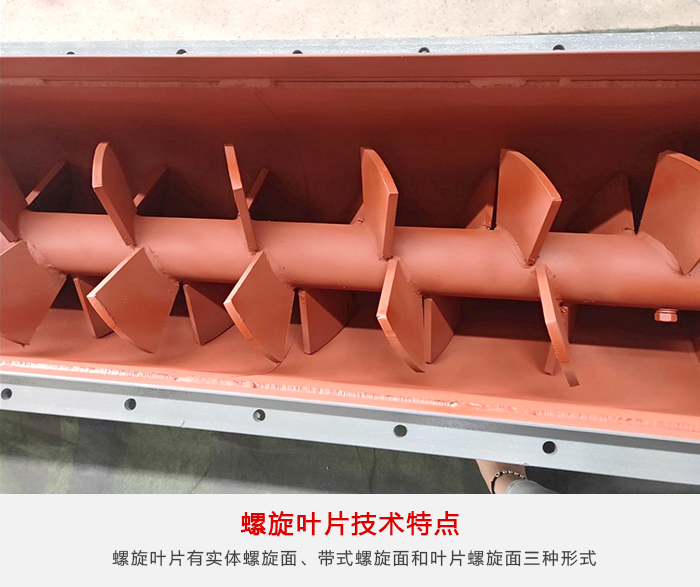 螺旋輸送機(jī)一般由輸送機(jī)本體、進(jìn)出料口及驅(qū)動(dòng)裝置三大部分組成;螺旋輸送機(jī)的螺旋葉片有實(shí)體螺旋面、帶式螺旋面和葉片螺旋面三種形式,其中,葉片式螺旋面應(yīng)用相對(duì)較少,主要用于輸送粘度較大和可壓縮性物料,這種螺懸面型,在完成輸送作業(yè)過程中,同時(shí)具有并完成對(duì)物料的攪拌、混合等功能。