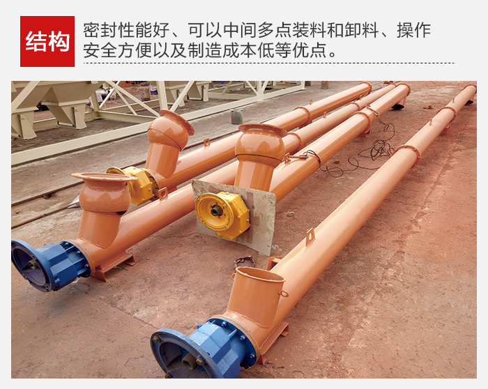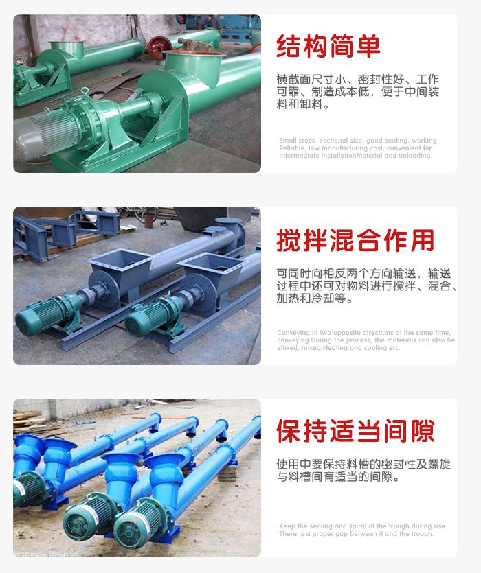 結(jié)構(gòu)簡(jiǎn)單、橫截面尺寸小、密封性好、工作可靠、制造成本低,便于中間裝料和卸料,輸送方向可逆向,也可同時(shí)向相反兩個(gè)方向輸送。輸送過程中還可對(duì)物料進(jìn)行攪拌、混合、加熱和冷卻等作業(yè)。通過裝卸閘門可調(diào)節(jié)物料流量。但不宜輸送易變質(zhì)的、粘性大的、易結(jié)塊的及大塊的物料。輸送過程中物料易破碎,螺旋及料槽易磨損。單位功率較大。使用中要保持料槽的密封性及螺旋與料槽間有適當(dāng)?shù)拈g隙。