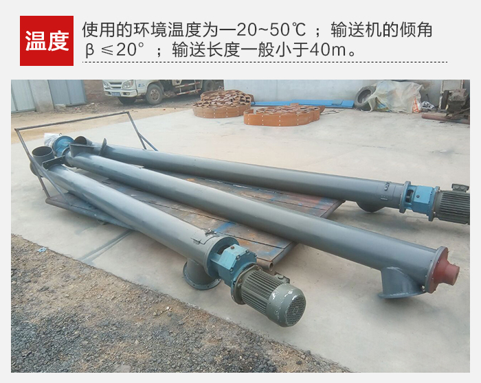 2、螺旋輸送機(jī)使用的環(huán)境溫度為—20~50℃ ;輸送機(jī)的傾角β≤20°;輸送長(zhǎng)度一般小于40m,最長(zhǎng)不超過70m。