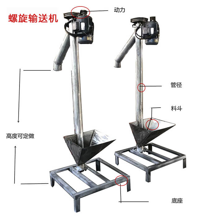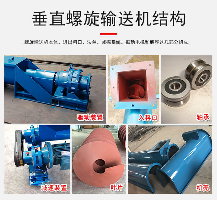 垂直螺旋輸送機螺旋輸送機本體、進出料口、法蘭、減振系統、振動電機和底座這幾部分組成。