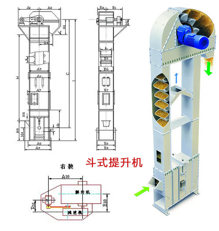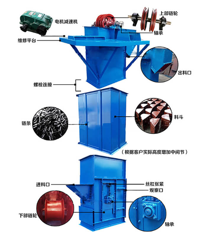 斗式提升機由料斗、驅動裝置、頂部和底部滾筒、膠帶 、張緊裝置和機殼等組成。