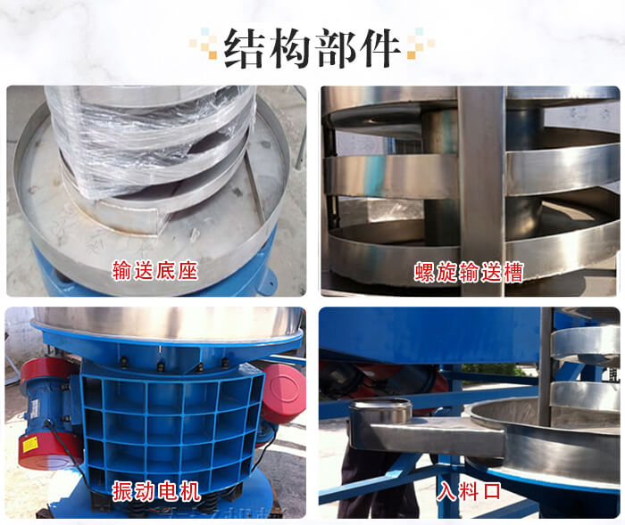 垂直螺旋提升機的主要結構由:進出料口、法蘭、減振系統、振動電機和底座這幾部分組成。