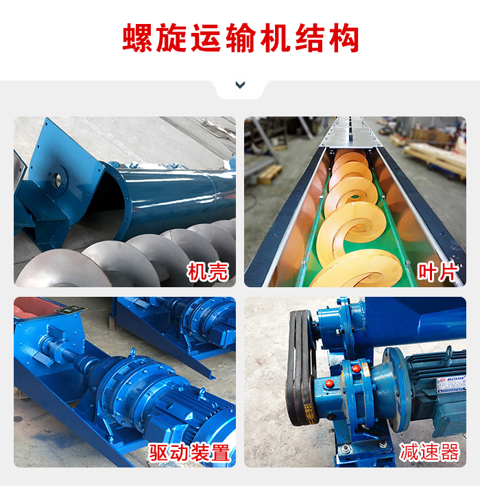 螺旋運(yùn)輸機(jī)一般由運(yùn)送機(jī)本體、進(jìn)出料口及驅(qū)動(dòng)裝置三大部分組成;螺旋運(yùn)輸機(jī)的螺旋葉片有實(shí)體螺旋面、帶式螺旋面和葉片螺旋面三種方式,其中,葉片式螺旋面應(yīng)用相對(duì)較少,首要用于運(yùn)送粘度較大和可壓縮性物料,這種螺懸面型,在完成運(yùn)送作業(yè)過(guò)程中,一起具有并完成對(duì)物料的拌和、混合等功用。
