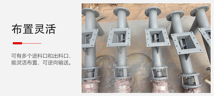 3、可有多個(gè)進(jìn)料口和出料口,能靈活布置,可逆向輸送,因此可以同時(shí)向兩個(gè)方向輸送物料;
