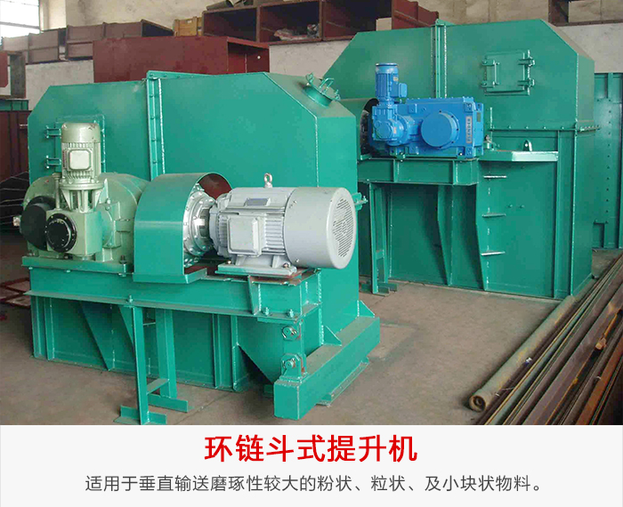 環(huán)鏈斗式提升機(jī)適用于垂直輸送磨琢性較大的粉狀、粒狀、及小塊狀物料,如糧食、煤、水泥、碎礦石等,輸送高度不超過(guò)40m,其特點(diǎn)為,結(jié)構(gòu)簡(jiǎn)單,運(yùn)行平穩(wěn),掏取式裝料,混合式或重力卸料,輪緣采用組合鏈輪,更換方便,鏈輪輪緣經(jīng)特殊處理壽命長(zhǎng),下部如采用重力自動(dòng)張緊裝置,能保持恒定的張力,避免打滑或脫鏈,同時(shí)在料斗遇阻時(shí),有一定的容讓性能夠有效地保護(hù)運(yùn)動(dòng)部件,物料溫度不超過(guò)250℃。
