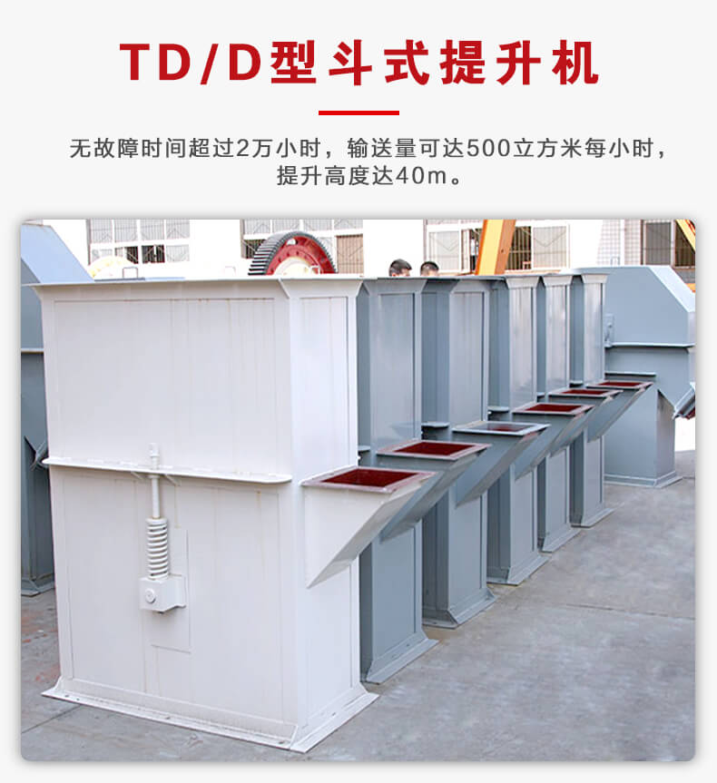 TD型斗式提升機由運行部分料斗與牽引膠帶、帶有傳動滾筒的 上部區(qū)段,帶有拉緊滾筒的下部區(qū)段,中間機殼,驅動裝置,逆止制動裝置等組成。無故障時間超過2萬小時,輸送量可達500m3/h,提升高度達40m。