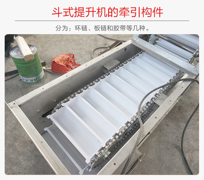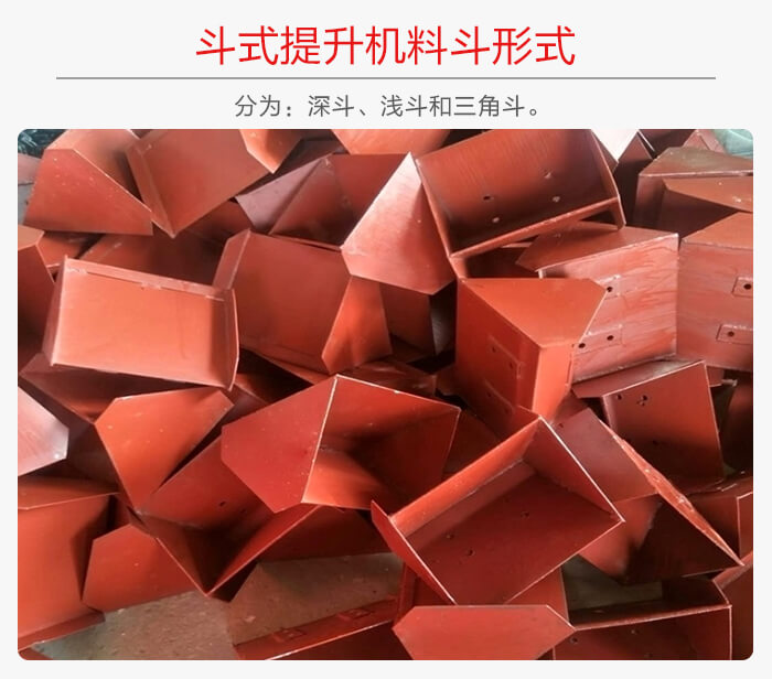 淺斗的斗中與料斗后壁的夾角小,每個料斗的裝載量小,但容易卸空,適于運送潮濕的和粘性的物料。深和淺斗在斗式提升及沿牽引構件長度方向間隔一定距離地固定在牽引構件上。