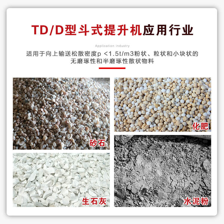 應用行業(yè):TD型斗式提升機適用于向上輸送松散密度p <1.5t/m3粉狀、粒狀和小塊狀的無磨琢性和半磨琢性散狀物料 ,如煤、砂、焦末、水泥、碎礦石等。