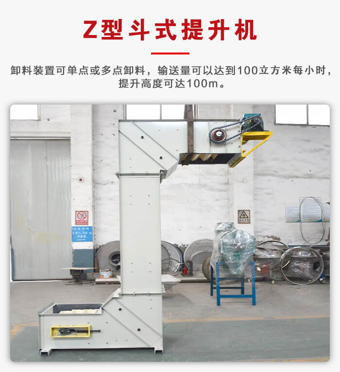 z型斗式提升機外形類似于“z”型,也叫做轉斗式提升機,可以單點或多點加料,通過卸料裝置完成單點或多點卸料,輸送量可以達到100㎡/h,提升高度可達100m。