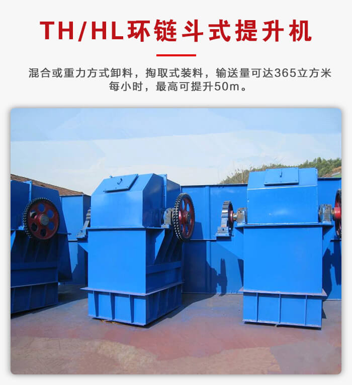 TH/HL環(huán)鏈斗式提升機牽引機構是兩根環(huán)形鏈條,為混合或重力方式卸料,掏取式裝料,輸送量可達365m3/h,最高可提升50m。